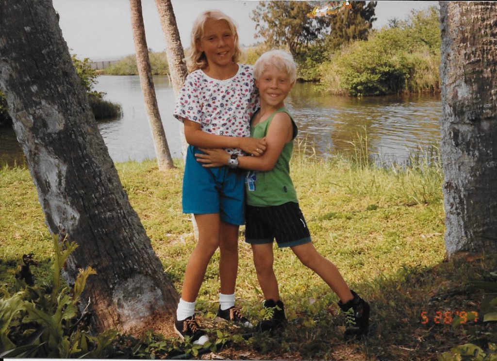 THROWBACK–Me, with my brother Zac, circa 1997. “Pretend like you LIKE each other!” my grandmother would say sing-songedly to us, while also sounding like she was reaching the end of her rope with our antics. She loved adventures, and took us on many throughout our childhood. This was outside of her condo, where sometimes alligators would hang out and sun.